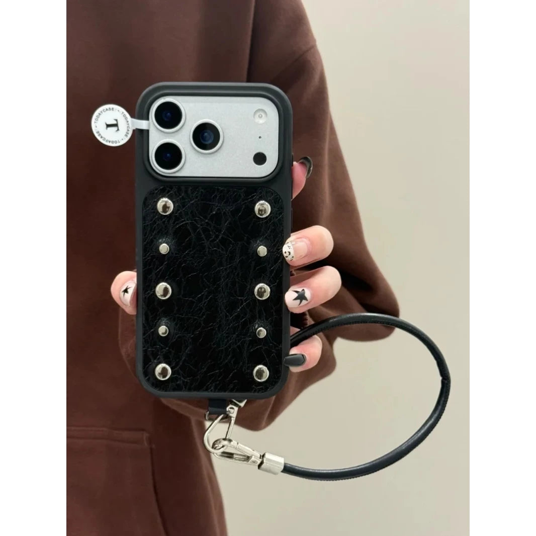 Rivet Leather Phone Case with Lanyard for iPhone 17/16/15/14/13 Series (Pro & Pro Max)